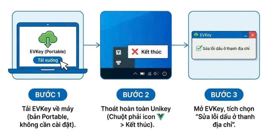 Nếu Unikey của bạn đã quá cũ, hãy chuyển sang dùng EVKey. Đây là bộ gõ tiếng Việt thế hệ mới được lập trình để fix triệt để lỗi gõ lặp chữ trên thanh địa chỉ Chrome và Excel.