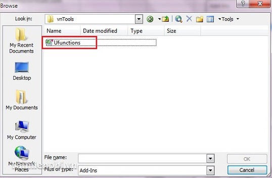 Bước 2: Hộp thoại hiện ra các bạn nhấn vào nút Browse… và chọn đường dẫn đến tập tin “Ufunctions.xls” mà các bạn tải về ở trên.