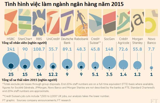 Tờ Financial Times cho biết hơn 10% tổng số nhân viên của 11 ngân hàng lớn tại Châu Âu và Mỹ đã bị cắt giảm từ đầu năm 2015 đến nay.
