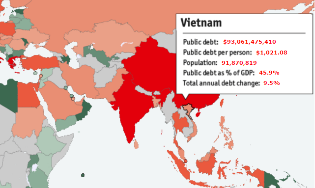 Tại thời điểm cuối 2014, nợ của trung ương tương đương 47,4% GDP; nợ do Chính phủ bảo lãnh là 11,3% trong khi nợ của địa phương là 0,8% (theo số liệu do Thứ trưởng Vũ Thị Mai cung cấp). Trong khi đó GDP của Việt Nam năm 2014 là 184 tỷ USD (theo Tổng cụ thống kê).