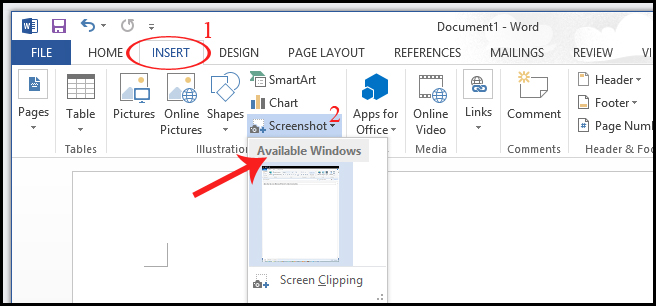 Tuy nhiên, Word 2013 đã rút gọn thao tác này vói tính năng Screenshot. Nghĩa là là người dùng có thể lựa chọn các cửa sổ đang chạy trên Windows, rồi chèn vào nội dung văn bản.
