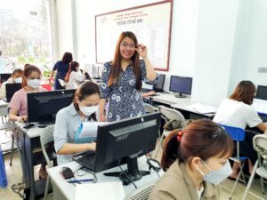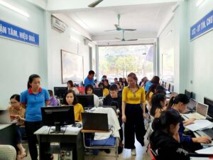 bên trong thấy rất nhộn nhịp và có lớp học nhiều máy tính và rất đông học viên đang thực hành. Mình nghĩ:
