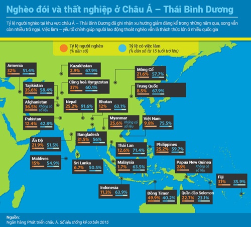 Dựa trên báo cáo Basic Statistics 2015 (Số liệu thống kê cơ bản), Ngân hàng Phát triển châu Á (ADB) nhận xét quá trình giảm nghèo tại khu vực châu Á – Thái Bình Dương đã có nhiều tiến triển đáng kể, nhưng tốc độ không đồng đều. Tỷ lệ có việc làm – yếu tố chủ chốt trong việc giúp nhiều người thoát đói nghèo, cũng vẫn còn thấp tại nhiều quốc gia.