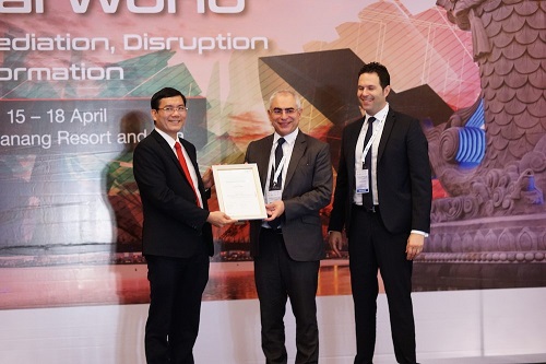Ông Nguyễn Thanh Đạm – Tổng giám đốc Vietlott (trái) nhận giấy chứng nhận “Chơi có trách nhiệm cấp độ hai” của Hiệp hội Xổ số Thế giới (WIA) tại Hội thảo thường niên APLA 2019 tại Đà Nẵng. |